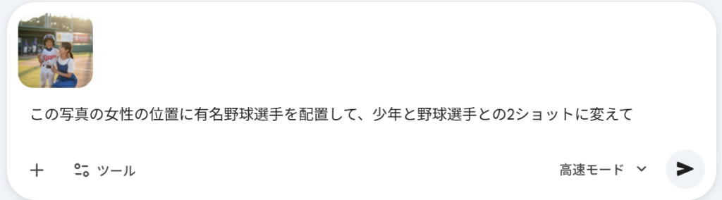 (ここでは架空の野球選手との2ショットにしていますが、某有名メジャーリーガーの写真にするよう指示できます。)