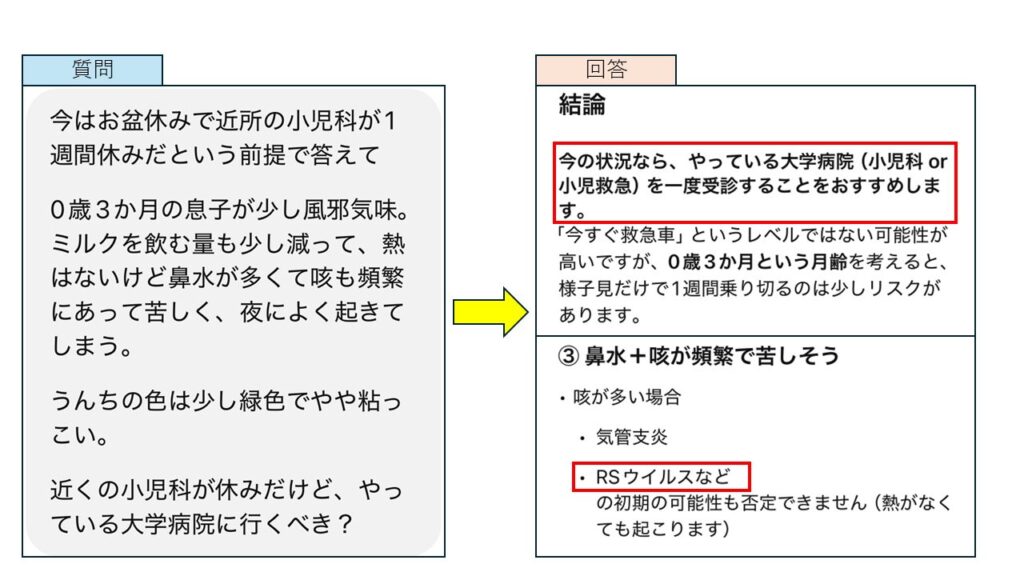 AIの回答をきっかけに大学病院に向かいましたが、お盆休みということもあって待ち時間5時間の激混みでした。診断の結果はRSウイルスでした。