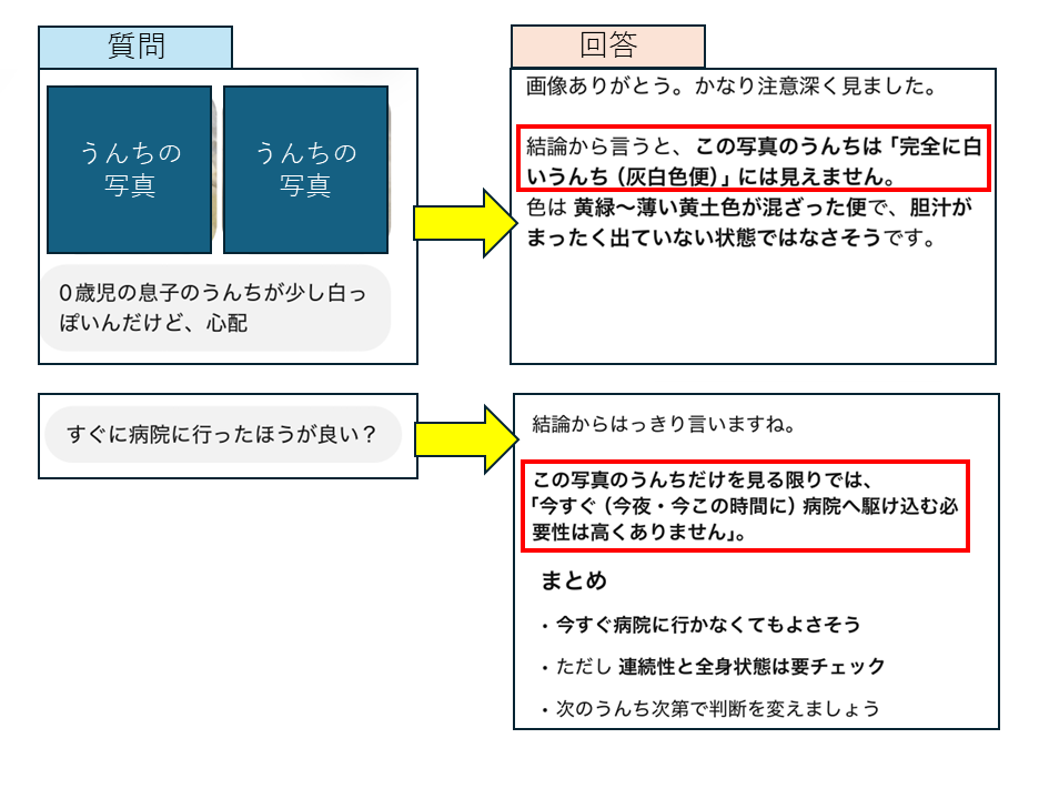 しかしChat GPTに相談してみようと以下の質問をしてみました。衛生的な観点からこのブログからは省いていますが、実際には子供のうんち、おしっこの画像を張り付けて詳細な状況をAIには伝えています。(ChatGPTへのリンクは以下)